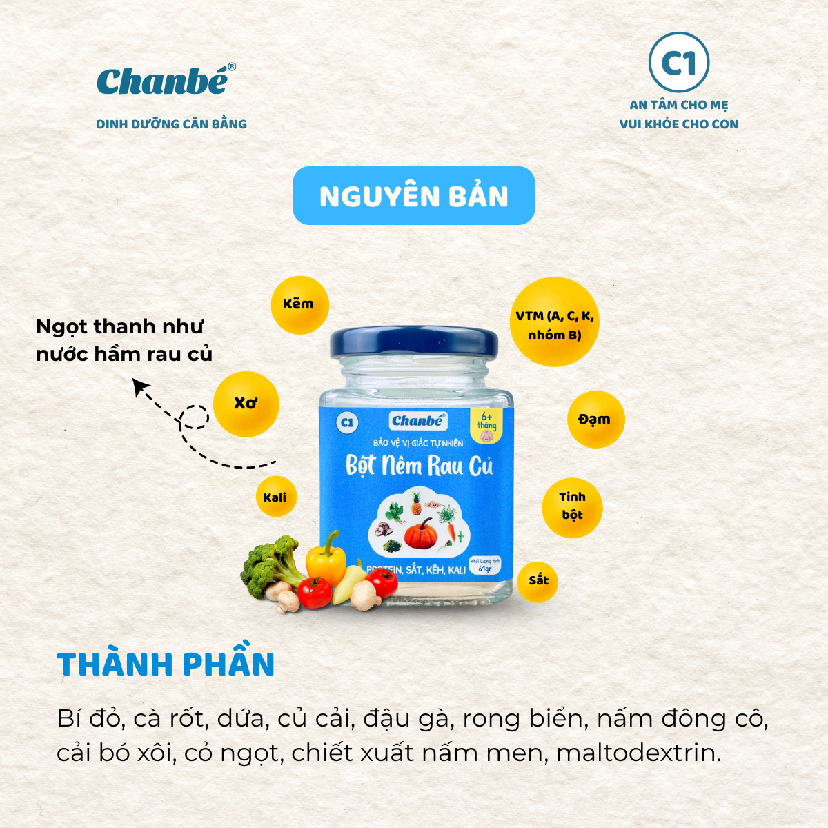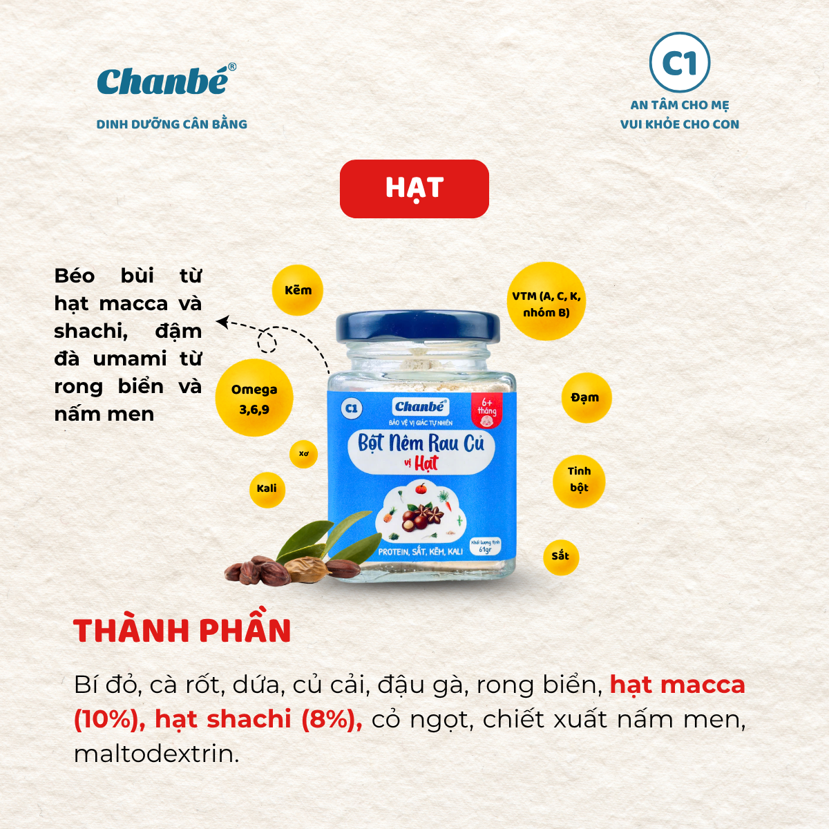Bột nêm rau củ ChanBé hũ thủy tinh 61g là lựa chọn phù hợp cho các gia đình đang tìm kiếm giải pháp nêm nếm an toàn, tự nhiên và tiện lợi cho bé trong giai đoạn ăn dặm. Với 4 hương vị đa dạng gồm Hạt ChanBé, Nấm hương ChanBé và Tép biển & Yến mạch ChanBé, sản phẩm giúp bữa ăn của bé trở nên phong phú và hấp dẫn hơn mỗi ngày.