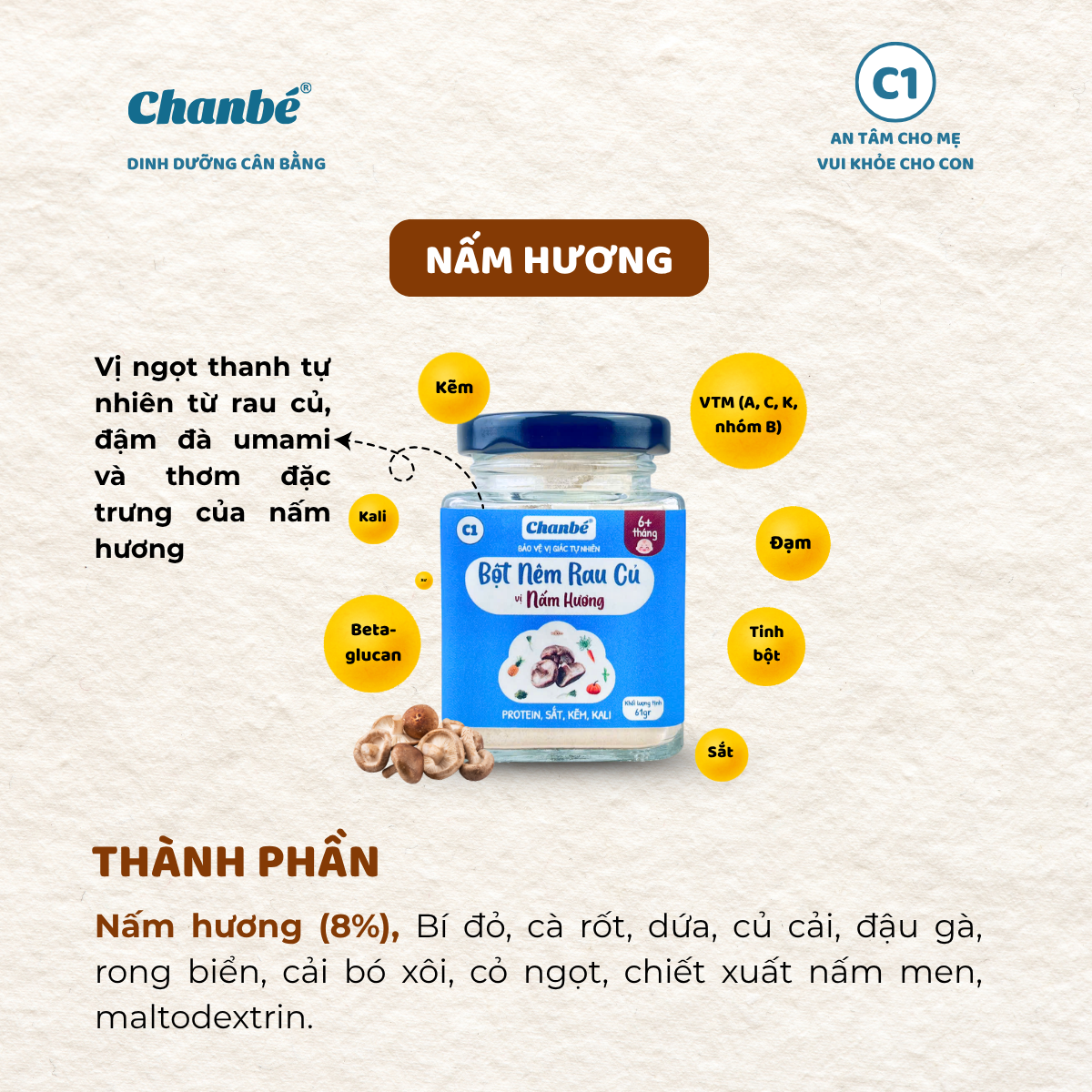 Bột nêm rau củ Nấm hương ChanBé mang hương thơm đặc trưng từ nấm, tạo cảm giác mới lạ cho món ăn của bé. Nấm hương không chỉ giúp tăng hương vị mà còn cung cấp thêm dưỡng chất tự nhiên.