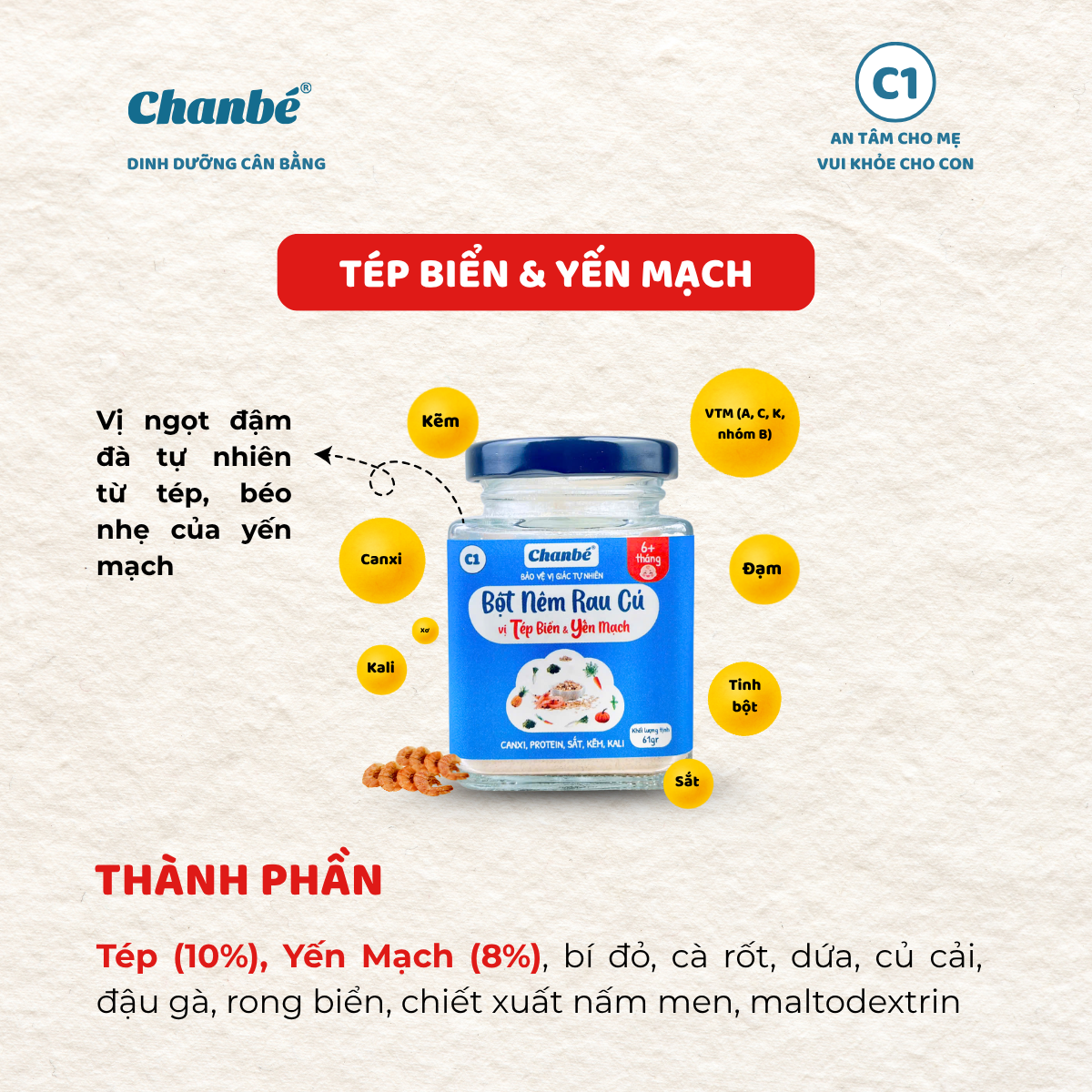 Sự kết hợp giữa tép biển và yến mạch tạo nên một dòng sản phẩm giàu dinh dưỡng và có hương vị đặc trưng. Bột nêm rau củ Tép biển & Yến mạch ChanBé không chỉ giúp món ăn thêm hấp dẫn mà còn bổ sung thêm nguồn đạm và chất xơ tự nhiên.