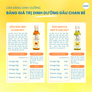 Nhất là các mẹ hơi lười giống tôi, tạm thời đừng đau đầu vì không biết nên chọn loại dầu ăn hạt mắc-ca hay gạo lứt, dầu hạt olive hay dầu gấc, dầu hạt cải hạt hạt sachi… Vì hôm nay, mình muốn chia sẻ đến các mẹ sản phẩm 6 trong 1 đầu tiên tại Việt Nam – dầu gấc ăn dặm mix 6 loại hạt của thương hiệu Chan Bé – sản phẩm dầu ăn đầu tiên kết hợp từ 6 loại hạt và quả quý giá: gấc đỏ, hạt macca, óc chó, đậu nành, gạo lứt, và hạt cải.